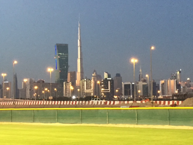 The baseball fields: a self-contained quad of baseball diamonds on a green plot of land in clear view of the Burj Khalifa